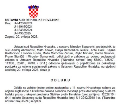 Ustavni sud je donio RJEŠENJE kojim je odbijen zahtjev za ocjenom ustavnosti “Zakona o načinu izvršenja presuda ESLJP-a u skupini predmeta Statileo protiv RH (br.z. 12027/10 i dr.) i Odluke Ustavnog suda RH (br.: U-I-3242/2018 i dr.)”.