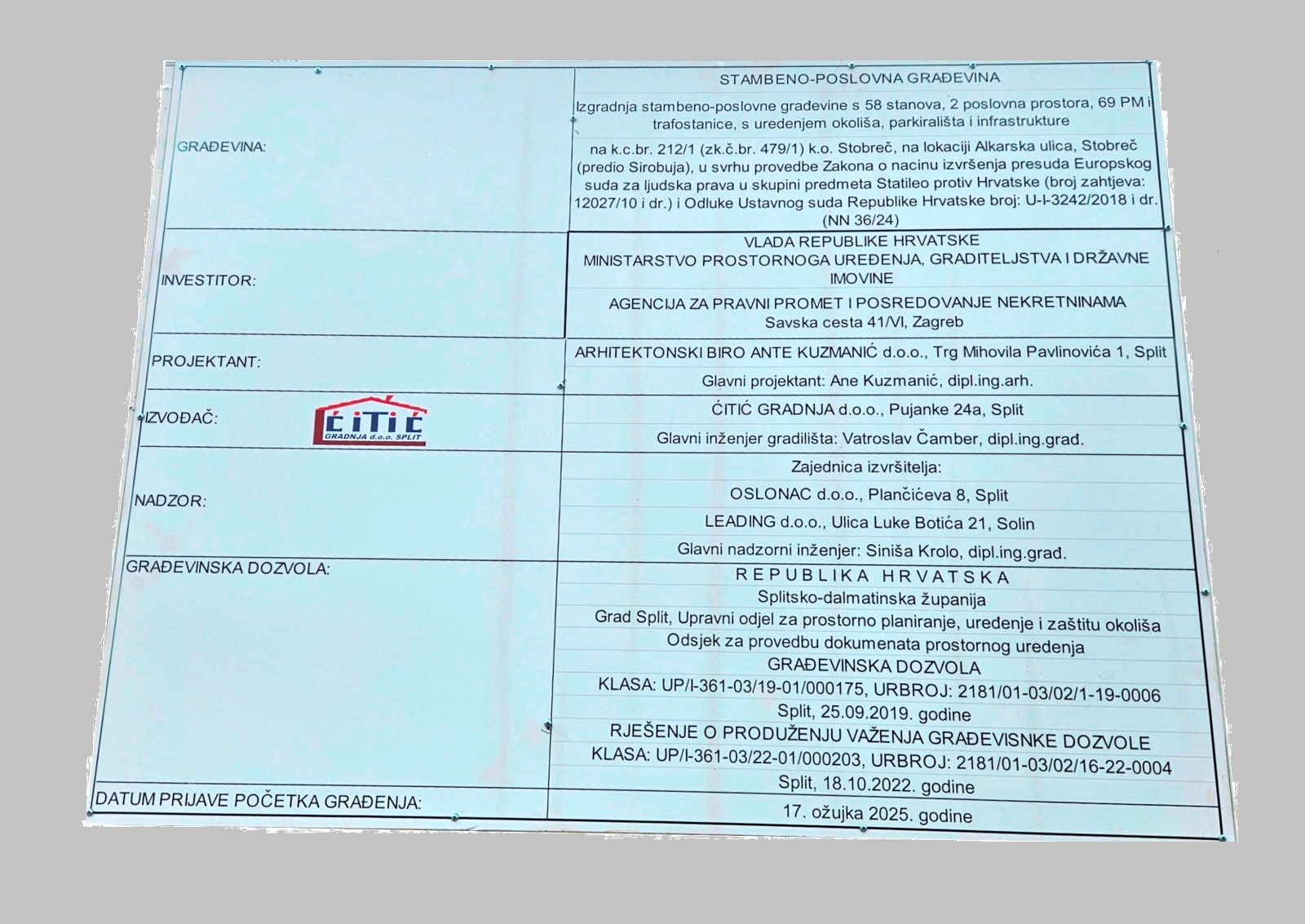 “Tako je Agencija za promet i posredovanje nekretninama (APN) odlučila na splitskoj Sirobuji graditi stambeno-poslovnu zgradu od pet katova s podrumom i nadgrađem koja bi bila smještena uz Alkarsku cestu. Zgrada bi imala 58 stanova, dva poslovna prostora i 69 parkirnih mjesta. Parcela za izgradnju je u vlasništvu APN-a, a ima 2642 metra kvadratna.”
