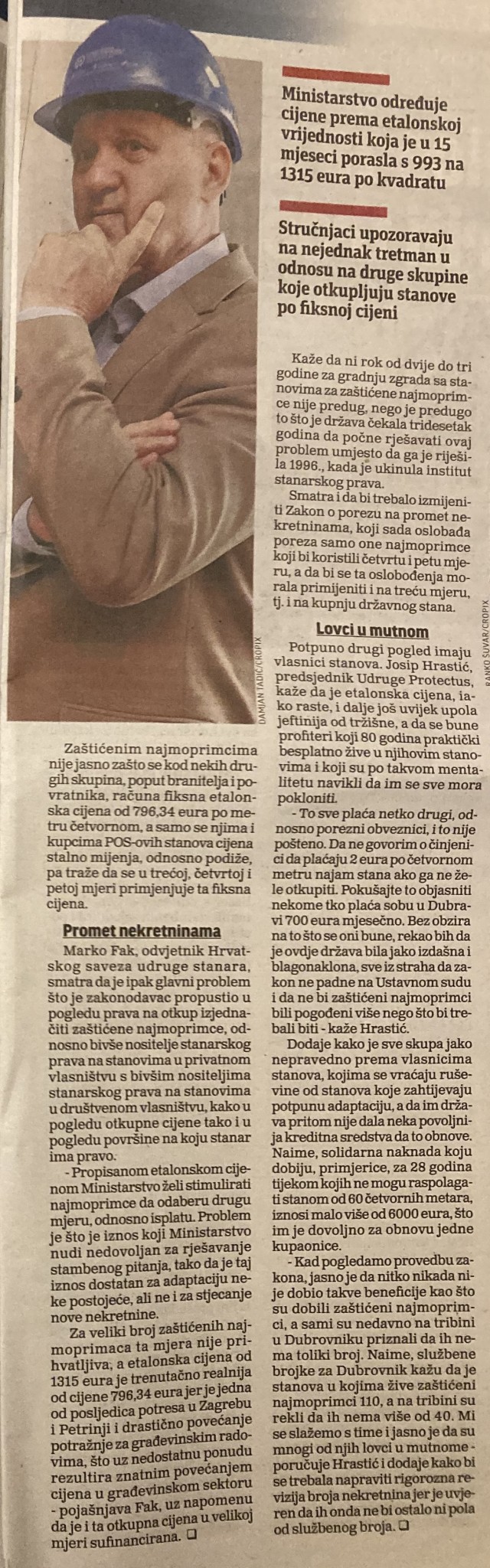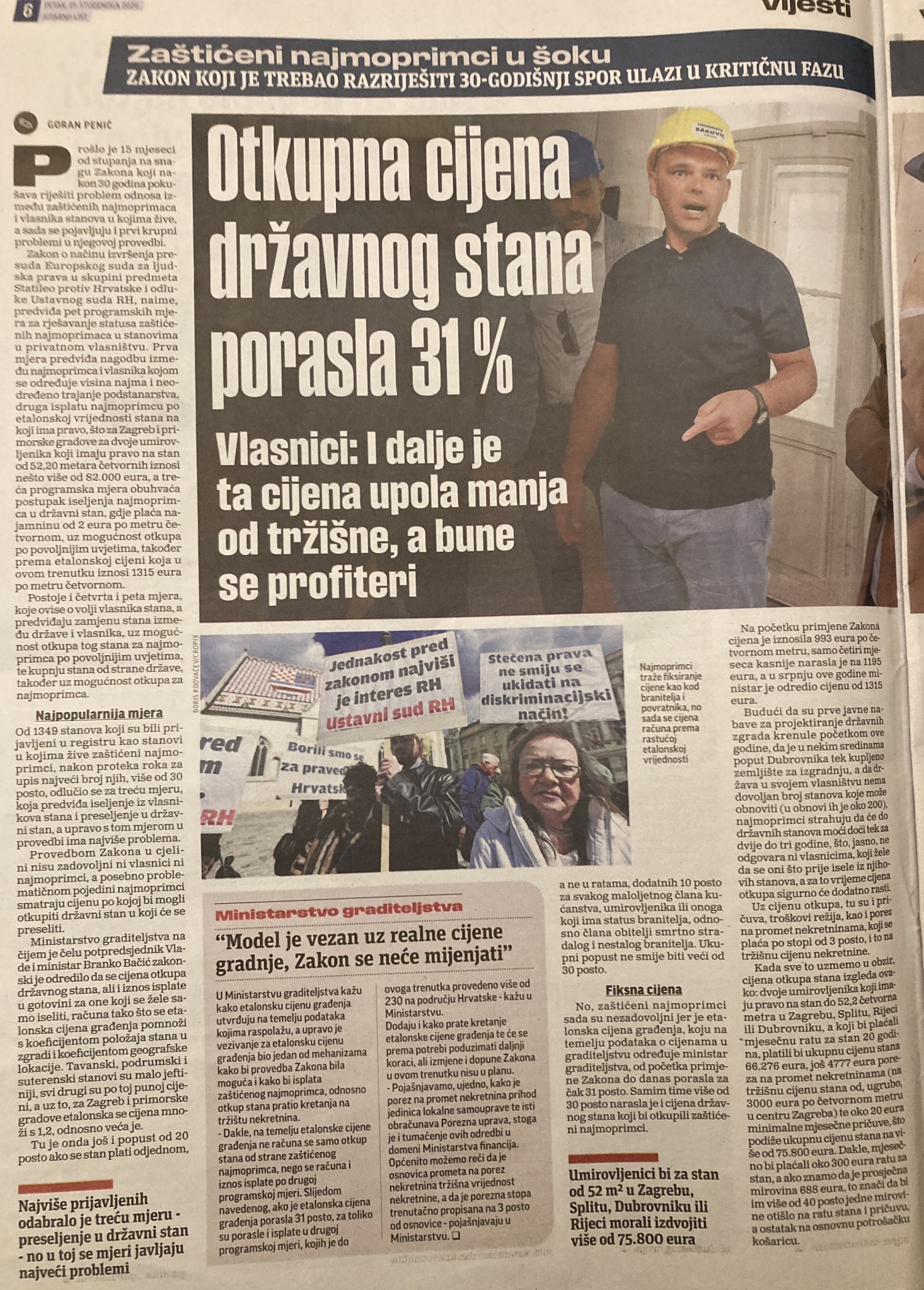 “…već sada stotinjak državnih stanova u koje bi se mogli preseliti zaštićeni najmoprimci spremno je za obnovu (ukupno ih je 576), u ožujku iduće godine započeti će gradnja zgrade sa 152 stana u zagrebačkom Blatu, a početkom veljače u Splitu na Sirobuji kreće izgradnja zgrade s 58 stanova…“